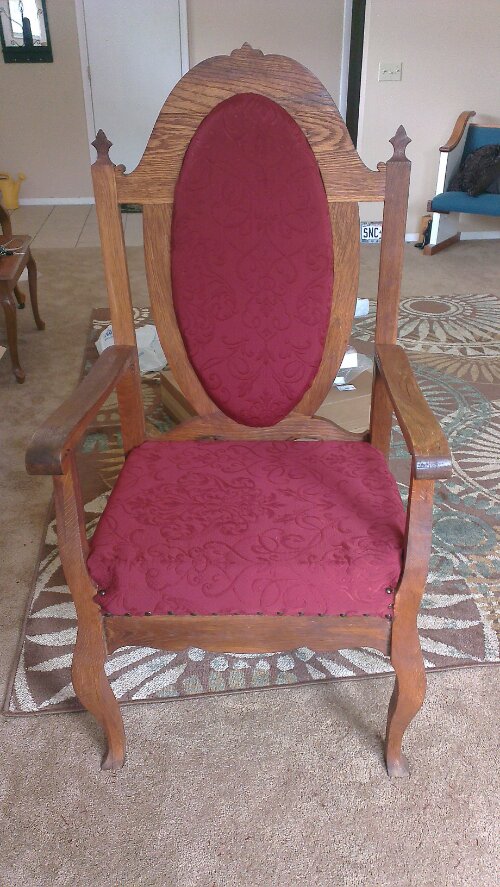 We got it finished, finally!! Our $30 find at an antique store here in town turned into an $80 chair, but look how much nicer it is! Daniel took it apart and stained it for me, then we bought the fabric, scissors, a staple gun, fabric glue and studs at Hobby Lobby. A few extra screws from Lowe’s and we were good to go!!